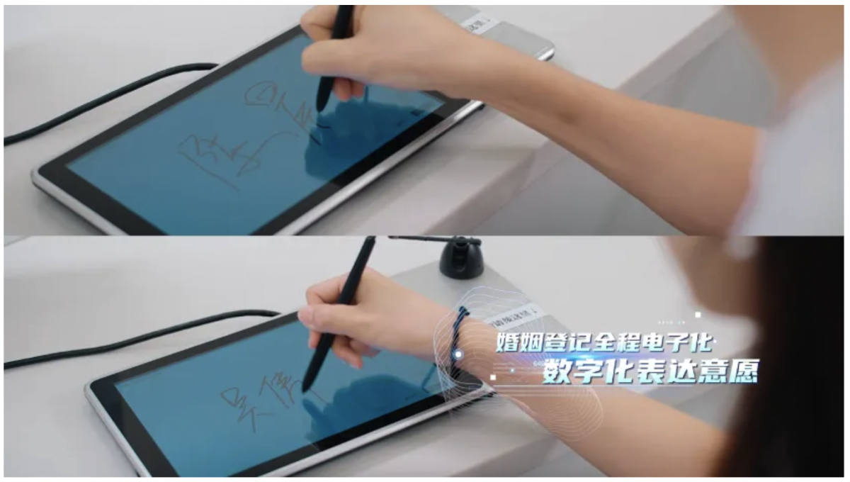 目前,重庆全市的婚姻登记处都接入了由亲笔签数字科技建设的全市统一电子化签名印章及存证服务。基于数字笔迹AI识别技术,新人不再需要在纸质表格上签字,而是通过电子签名板,1次签名捺印即可完成《结婚登记审查处理表》、《申请结婚登记声明书》、《婚姻登记个人信用风险告知书》、《结婚登记告知单》等所有文件的签署,登记时间由原来的半小时缩短至10分钟,极大简化了传统婚姻登记的繁琐流程,实现了婚姻登记业务的全程电子化办理。