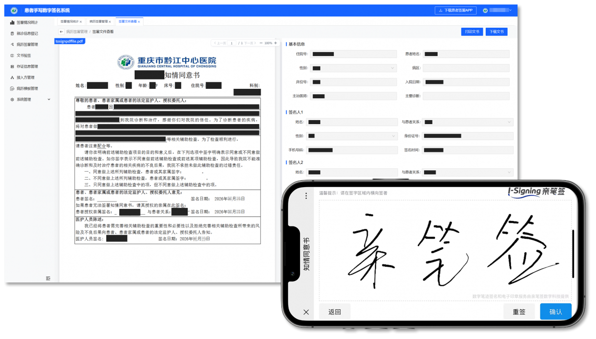 在这幅宏伟画卷中,重庆亲笔签数字科技有限公司(以下简称“亲笔签”)依托领先的数字笔迹AI识别技术,为区域医疗数字化转型构筑覆盖医护技患全角色的可信电子签名签章体系,成为黔江医改智慧医院建设中不可或缺的数字信任基石。